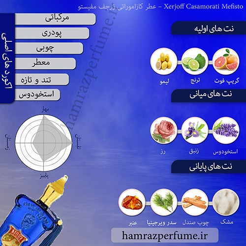 عطر کازاموراتی زرجف مفیستو- Xerjoff Casamorati Mefisto عطری مردانه جنتلمن با یک ترکیب کامل و بی نقص با گروه بویایی مرکبات معطر .عطر کازاموراتی زرجف مفیستو Xerjoff Casamorati Mefisto در سال 2009 به بازار عرضه شد و توانست نظر بسیاری از عاشقان عطر و رایحه را به خود جلب کند. این عطر یکی از محبوب ترین عطر های برند لوکس ایتالیایی زرجف است.  نت های اولیه این عطر گریپ فروت، ترنج و لیمو آمالفی (مرکبات معطر ایتالیایی) هستند. نت میانی اسطوخودوس، زنبق و رز است. نت های پایانی از مشک، چوب صندل، سدر ویرجینیا و عنبر تشکیل شده است که عطر کازاموراتی زرجف مفیستو را تبدیل به عطری کلاسیک کرده  ، که میتوان از آن در هر زمان و مکانی  استفاده کرد .